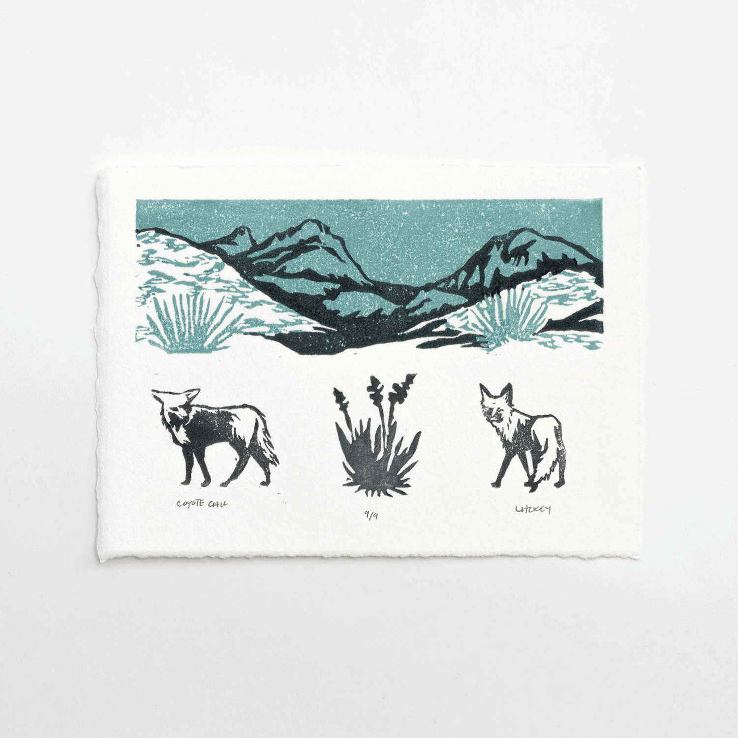 Making the Coyote Call print was an exploration in play, but I felt I could push the elements further to be more than fine art. I chose a 22" bandana as my medium and began to pull pieces of it and my Spring Ocotillo print in order to create the repeating pattern. The process started by singling out each color layer and selecting the pieces, such as the desert plant, I would keep.