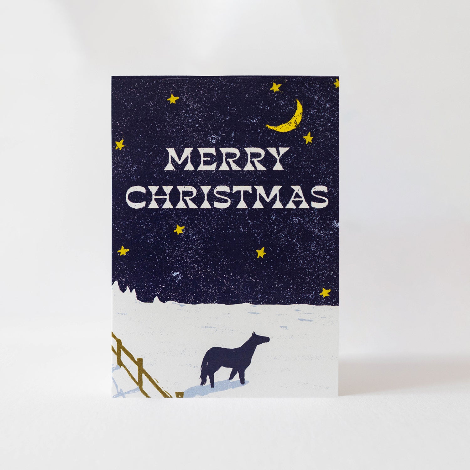 A new take on the 2023 Christmas Card From an Artist design featuring a horse in a snow-covered pasture gazing at the stars.
