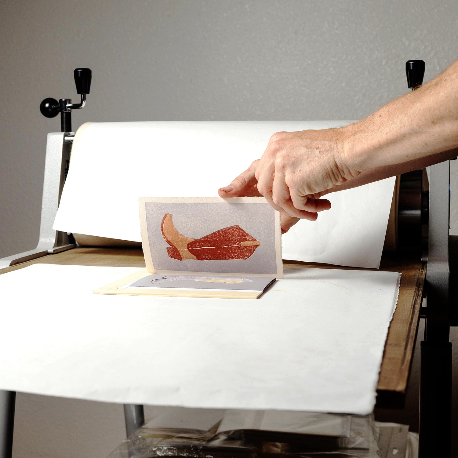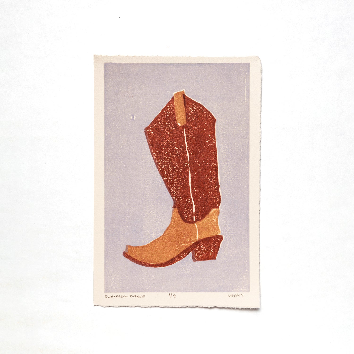 The Summer Dance | Cowgirl Boot Print was inspired from the idea of choosing the perfect cowboy boot for various occasions. In this print the red tops make a bold statement, while the subtle lavender background evokes a feeling of a cool summer evening, hence the name.