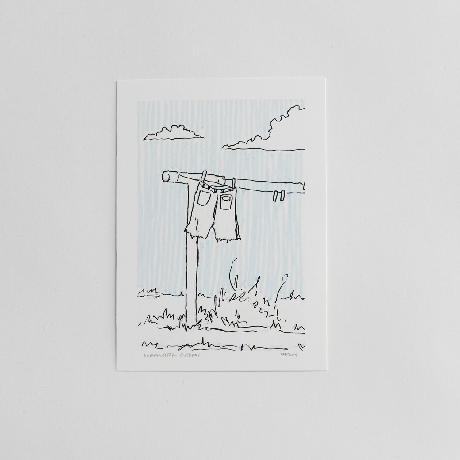 Pulled from my travel sketchbook is this ink and marker piece created watching Wrangler cutoffs dry on the line.